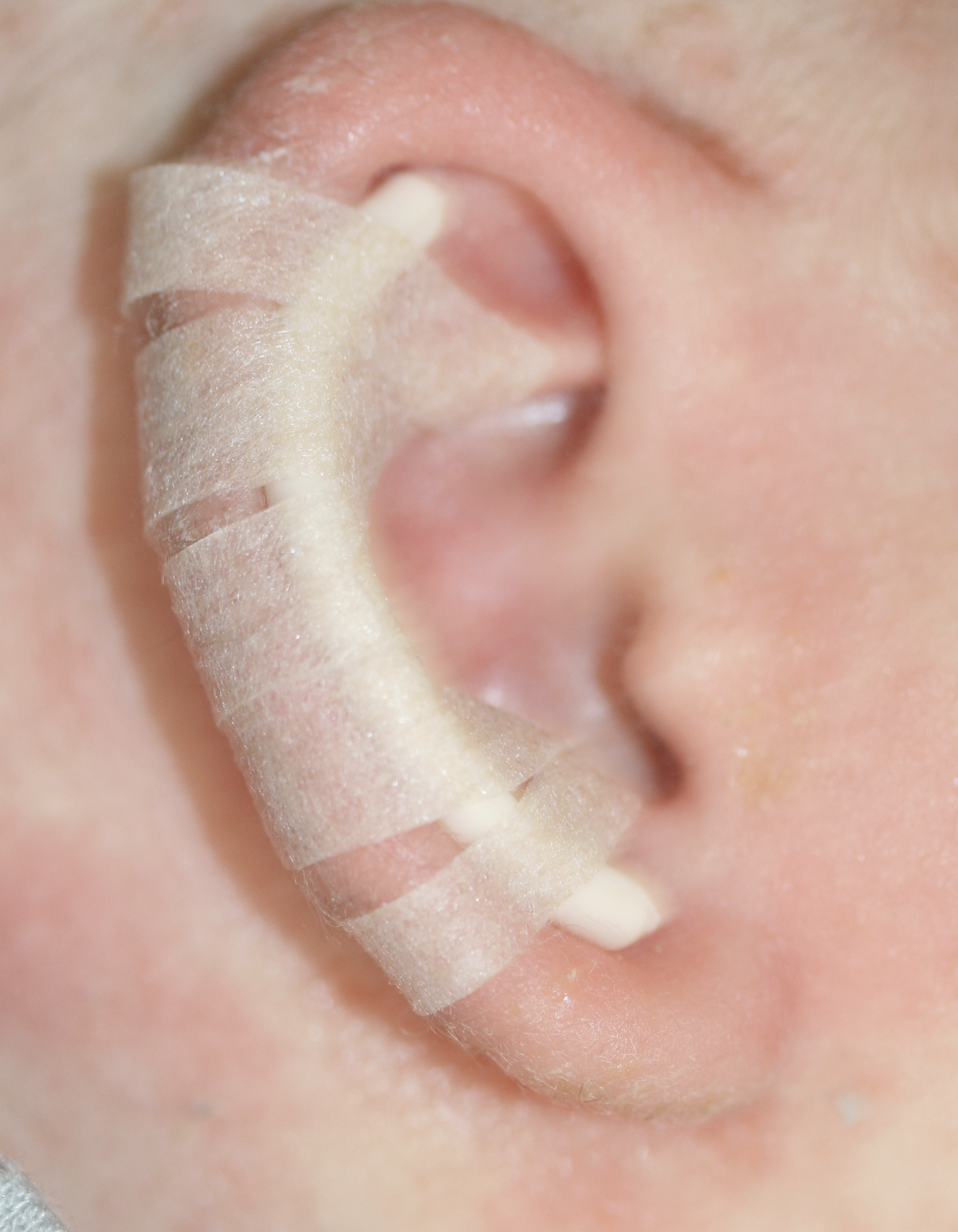 The splints are fitted into the gully (scaphal hollow) of the ear and fixed by narrow strips of tape, and then the whole ear is taped to the side of the head using a wide tape strip. The pressure of the splint in the scaphal hollow resets the natural spring of the ear cartilage, correcting any tendency to make the ears stick out whilst reshaping the proper contours of the rest of the ear. DO NOT simply stick baby’s ear to the side of the head without first fitting the splint. This can distort the shape of the ear, particularly the rim, and is actively discouraged.